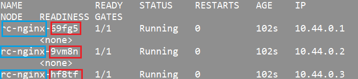 위의 그림에서 파랑색 네모칸으로 체크한 것은 파일 내에서 선언한 rc-nginx의 공통값으로 들어가는 것이다. 뒤의 빨강색 네모박스는 내가 선언한 것이 아닌. 쿠버네티스가 만들어내는 해시 값이다. (Pod의 이름이 보장되지 않는다.)