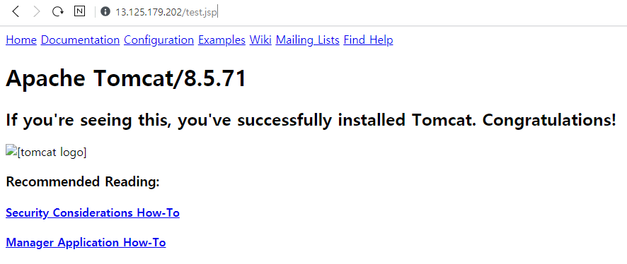 apache 서버 인스턴스의 공인 ip로 접속후 tomcat 서버에 존재하는 index.jsp를 요청했을때 jsp 파일을 잘 불러오는 것을 확인 할 수 있었다.