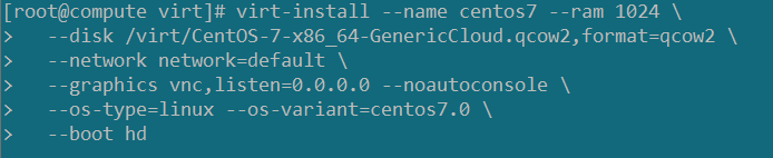 virt-install --name [가상머신 이름] --ram 1024 \ --disk [qcow2 파일 이름 포함한 절대 경로],format=qcow2 \ --network network=default \ --graphics vnc,listen=0.0.0.0 --noautoconsole \ --os-type=linux --os-variant=