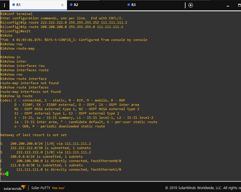 s (static) - 정적으로 설정한 라우터라고 보여준다. 이렇게 R2, R3 모두 직접 연결돼 있지 않은 네트워크 대역에 대해 전부 라우팅 테이블을 설정해 주겠다.
